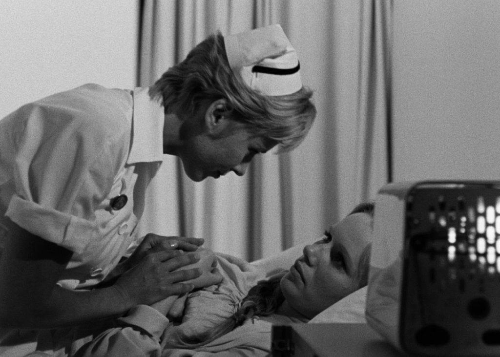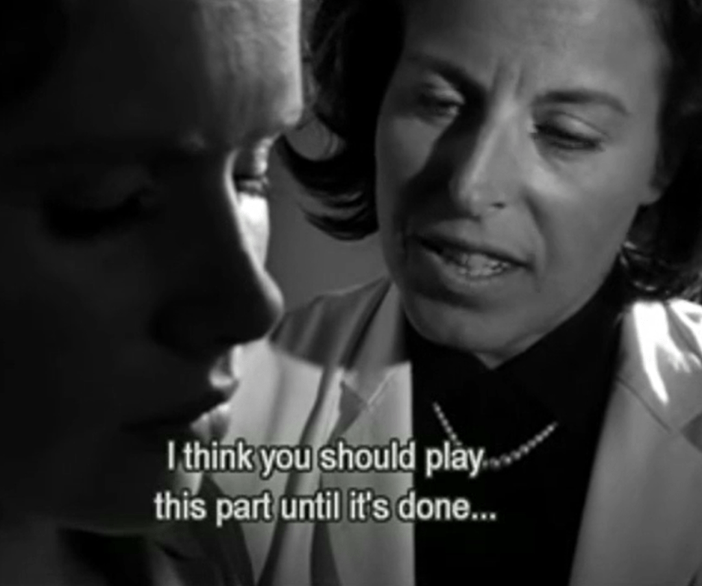 وفي واحد من أكثر الحوارات تقشّفا وصرامة في تاريخ السينما، تجلس الدكتورة شارون أمام إليزابيث، الممثلة التي سكتت فجأة على خشبة المسرحة واختارت الصمت وأصرت أن لا تعود. ولا يبدو على شارون أي اضطراب، بل تتحدث بنبرة من يعرف تماما ماذا يرى، قائلةً لها، وببساطة قاطعة: “أفهمك ويعجبني ما تفعلينه. أظن أن عليك أن تكملي هذا الدور الذي تلعبينه الآن حتى النهاية.”