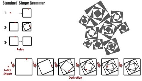فكما أن اللغة تنتقل من الجذر إلى الاشتقاق، فإن التكوين المعماري، وفق قواعد الشكل، ينتقل من النواة إلى التشكيل بواسطة عمليات إنتاج (production rules) تشمل التكرار والانعكاس والتوسع والحذف والإزاحة والتحوير.