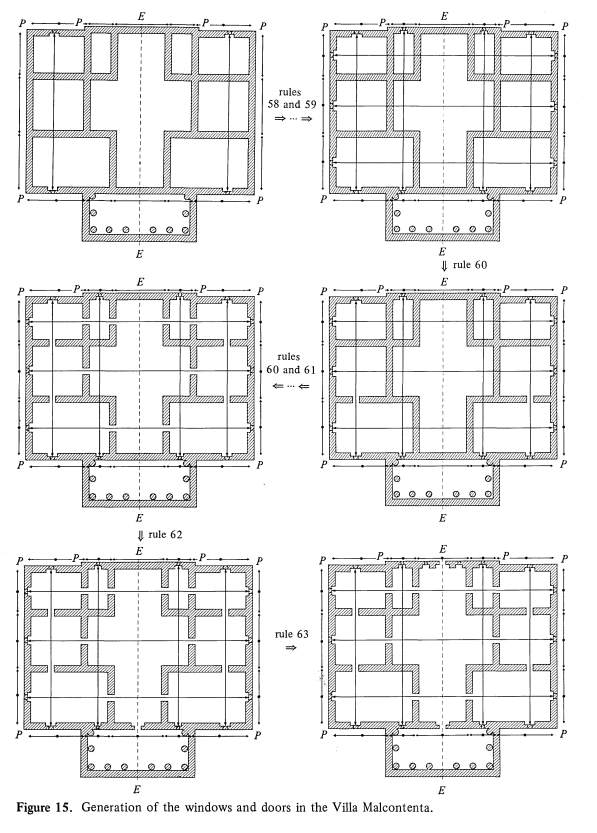 إن قواعد الشكل لم تكن يوما مجرد خيال نظري. لقد ولدت من تحليل صارم أحد أبرز أمثلته ما قام به George Stiny و William Mitchell حين قاما بتحويل تصاميم Andrea Palladio إلى مجموعة من القواعد التوليدية. ففي دراستهما The Palladian Grammar الصادرة سنة 1978 لم ينظرا إلى فلل بالاديو كتحف كلاسيكية بل كنظام لغوي يمكن توليده. فاستخدما تقنيات تشبه الإعراب في النحو، وحددا عناصر التماثل، ومراكز المحاور، وتقسيمات المسقط، ثم قاما بتحويل كل ذلك إلى قواعد اشتقاقية تسمح بإنتاج فلل جديدة تلتزم بروح بالاديو دون أن تكون مجرد نسخ. وكهذا لم تعد الفيلا كائنا فرديا، بل نتيجة لقواعد يمكن تفكيكها وإعادة تركيبها.