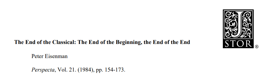 وهنا يتداخل هذا الإدراك مع ما جاء في ورقة بيتز آيزنمان The End of the Classical حيث اقترح أن الشكل المعماري لا يجب أن يتبع الوظيفة كما في الحداثة، بل أن يتحرر ضمن مفهوم ما بعد الوظائفية Post-functionalism: أن يولد الشكل لا كأداة، بل ككيان مستقل، يحمل منطقه الخاص خارج حدود الدلالة المباشرة.