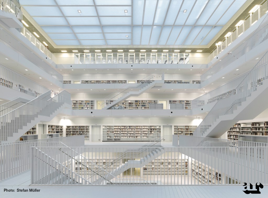 ثم قفزت إلى ذهنه حالة دراسية أخرى لم يكن على علم بها قبل أن يرى تحليلا من قبل أحد الطلبة في واحدة من جلسات تحكيم Jury السنة الخامسة: مكتبة المدينة في شتوتغارت. ذلك الصندوق الأبيض الذي صممه Eun Young Yi، لا كصرح معرفي فقط بل كمجسم ضوء تقريبا. يتدرج الزائر صعودا حول فراغ مكشوف للضوء، لا بحثا عن نهاية، بل كأن كل مستوى يعيد كتابة غايته، في مسار تحكمه سكينة هندسية، لا ضجيج فيه سوى وقع الخطى! وكأن كل طابق يكشف نفسه كامتداد للصمت، حيث تتكرر الحركة حول الفراغ لا للوصول، بل لتثبيت الإقامة في المعنى، تحت ضوء يصفي التجربة دون أن يختزلها.