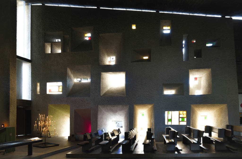 في كنيسة رونشان Ronchamp Chapel لم أصمم جدرانا بل حوامل ضوء. الفراغ هناك لا يصغي إليك بل يجبرك أن تصغي أنت له. والنوافذ ليست فتحات، بل أجهزة توجيه شعوري. وكل انحناءة في السقف، وكل ثقل في الجدار، ليس تزيينا، بل توجيه إدراكي نحو الداخل.