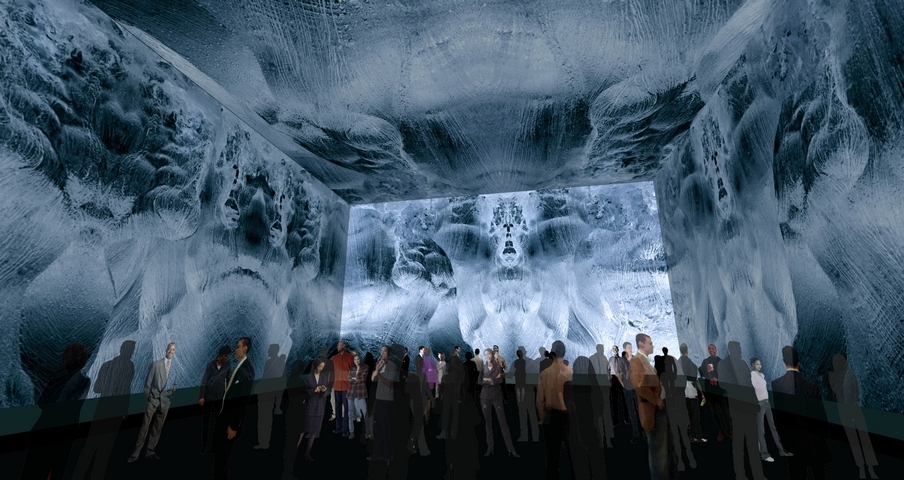 المبنى يبدو ككتلة شفافة بنيت من تحت جليد حي، لا من زجاج. وواجهاته متعددة الطبقات، تعكس الضوء وتكسره وتعيد توزيعه داخل الفراغ كما تفعل الكتل الجليدية في الطبيعة. والشكل الخارجي لم يكن هدفا في ذاته، بل نتاج تفاعل بين الضوء ومواد شديدة الحساسية، ودرجة الحرارة.