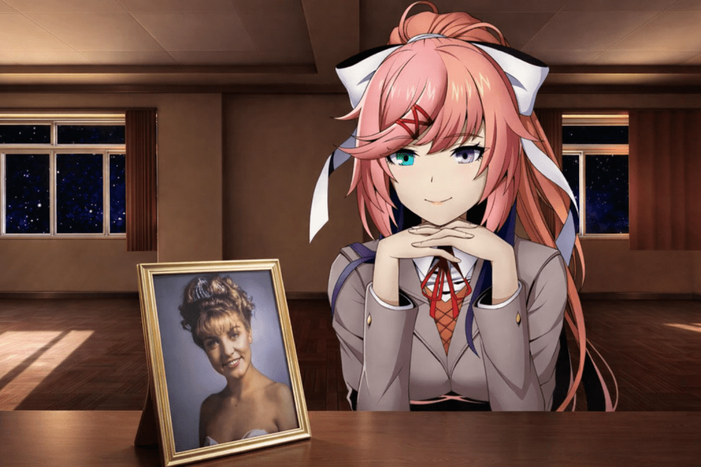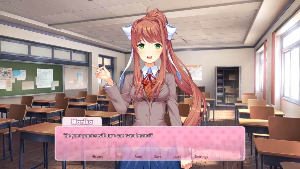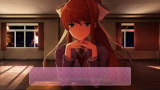 في Doki Doki Literature Club يحدث هذا داخل غرفة صغيرة، لكن المشكلة ليست في صغرها وحده. المشكلة في طريقة تأطيرها. الكادر نفسه يبدو كأنه أعيد تفريغه عمدا حتى لا يبقى فيه سوى مونيكا وكمية قاسية من negative space. ليس فراغا يريح العين، بل فراغا يسحب من المشهد عمقه، كأن اللعبة لم تترك حولها عالما بل تركت حولها نقص العالم.