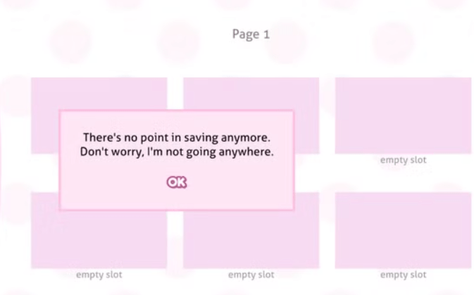 ولأن اللعبة لا تستطيع أن تمنحها هذا النوع من الاختيار من داخل بنيتها، تلجأ مونيكا إلى الحل الوحيد المتبقي لها: أن تختصر العالم كله بحيث لا يبقى إلا اختيار واحد، أو بالأحرى بحيث لا يبقى شيء اسمه اختيار أصلا.